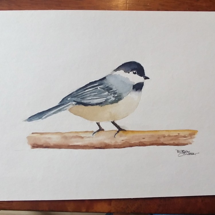 Here’s a look at a black-capped chickadee that I completed recently. We have a number of these little guys that visit our feeder. In real life, the eyes are almost invisible… perhaps I should darkened the reflection a touch. But I’ve ruined more paintings by adding just that one more little touch. I’d also like to refine the feathers just a little bit, but again, I wanted to quit while I was more or less ahead.