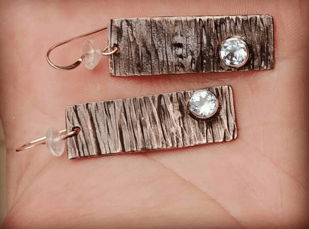I’ve just completed this commission for gallery owner Sarah Bernzott(thanks, Sarah!). These earrings are hot-forged nickel on copper with 5mm baby blue topaz in fine silver bezels, with blue topaz beads on 14/20 gold-filled earwires. I used Halsteads to source the bezel settings and earwigs, and they’re high in quality… I’m glad I ordered a bunch of them!