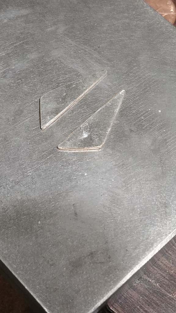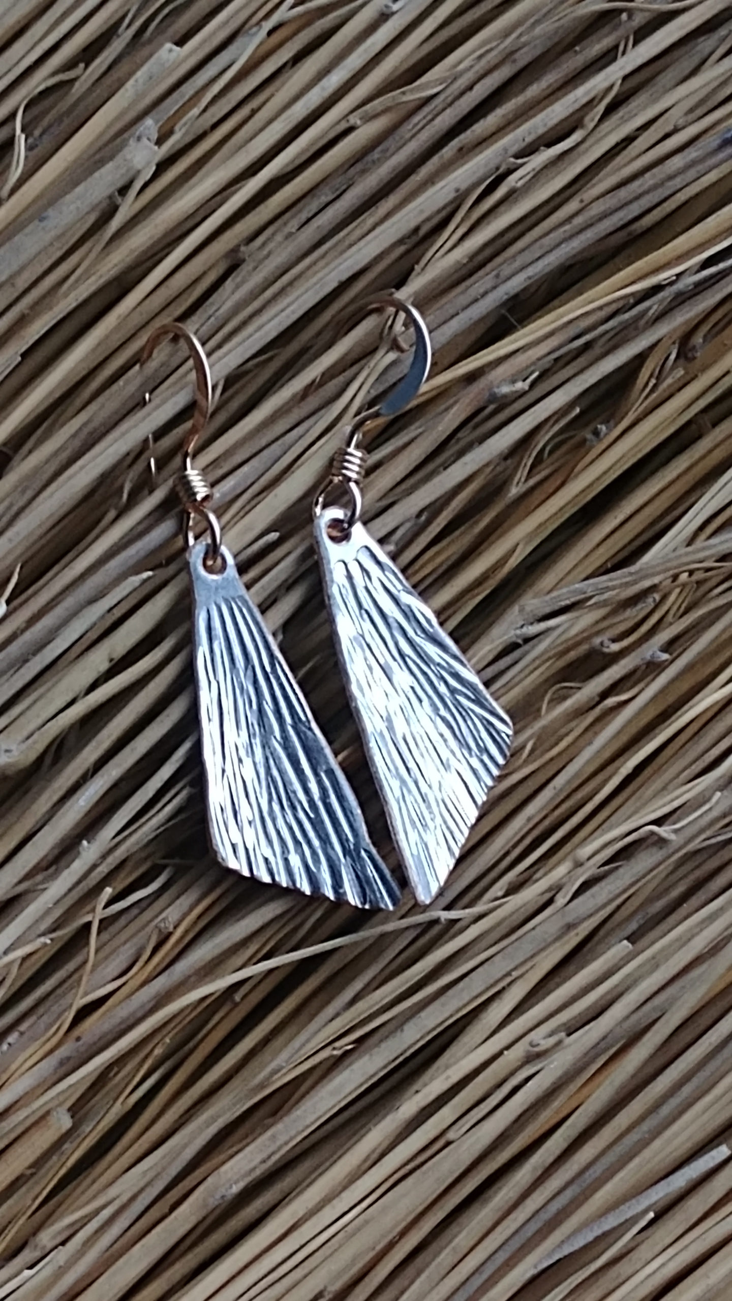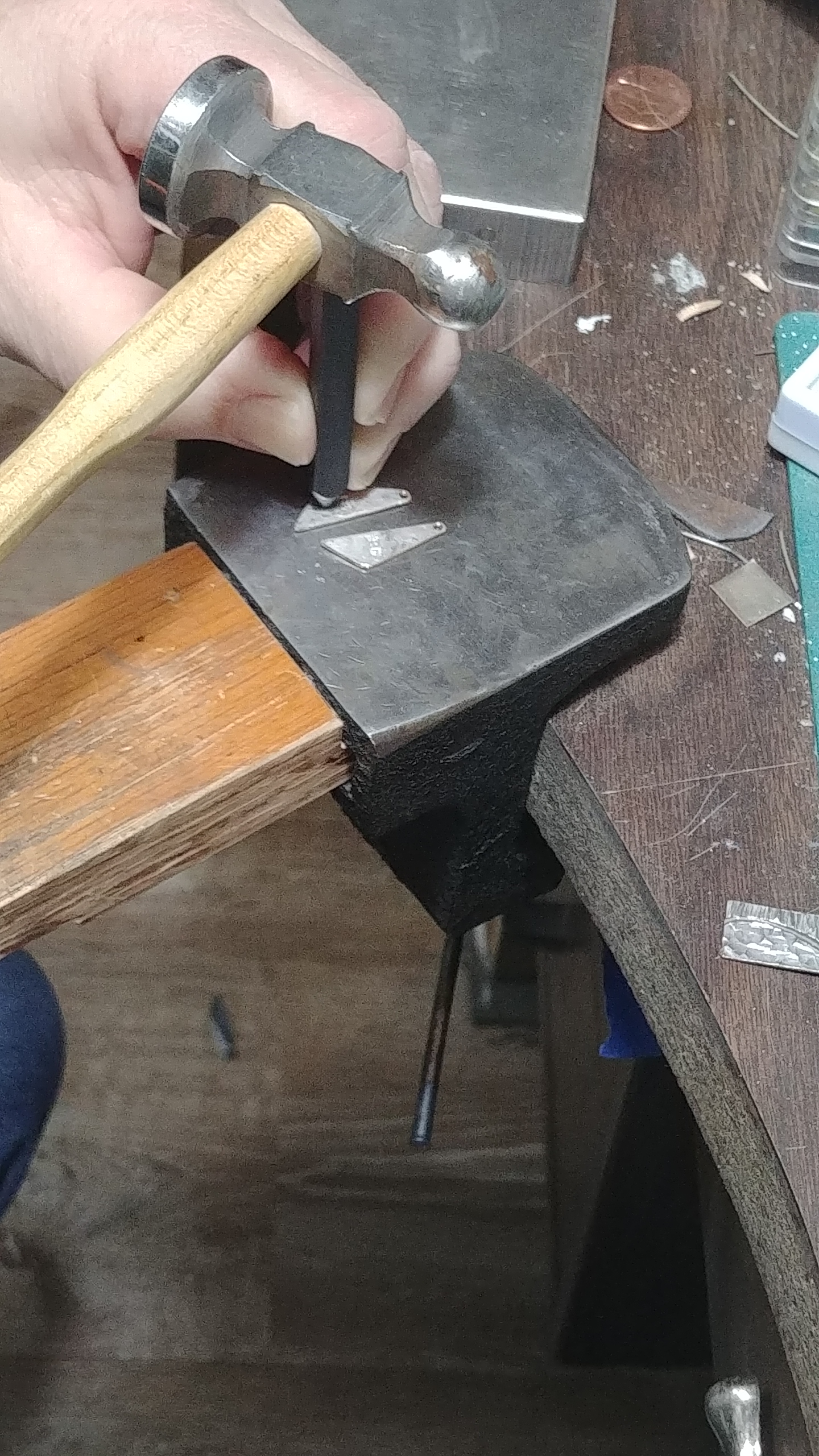 After completing a commission, I had a small silver octagon cutout left over. Trimming the edges left a pair of triangular shapes, so these were filed, drilled, and textured. These earrings were the result.