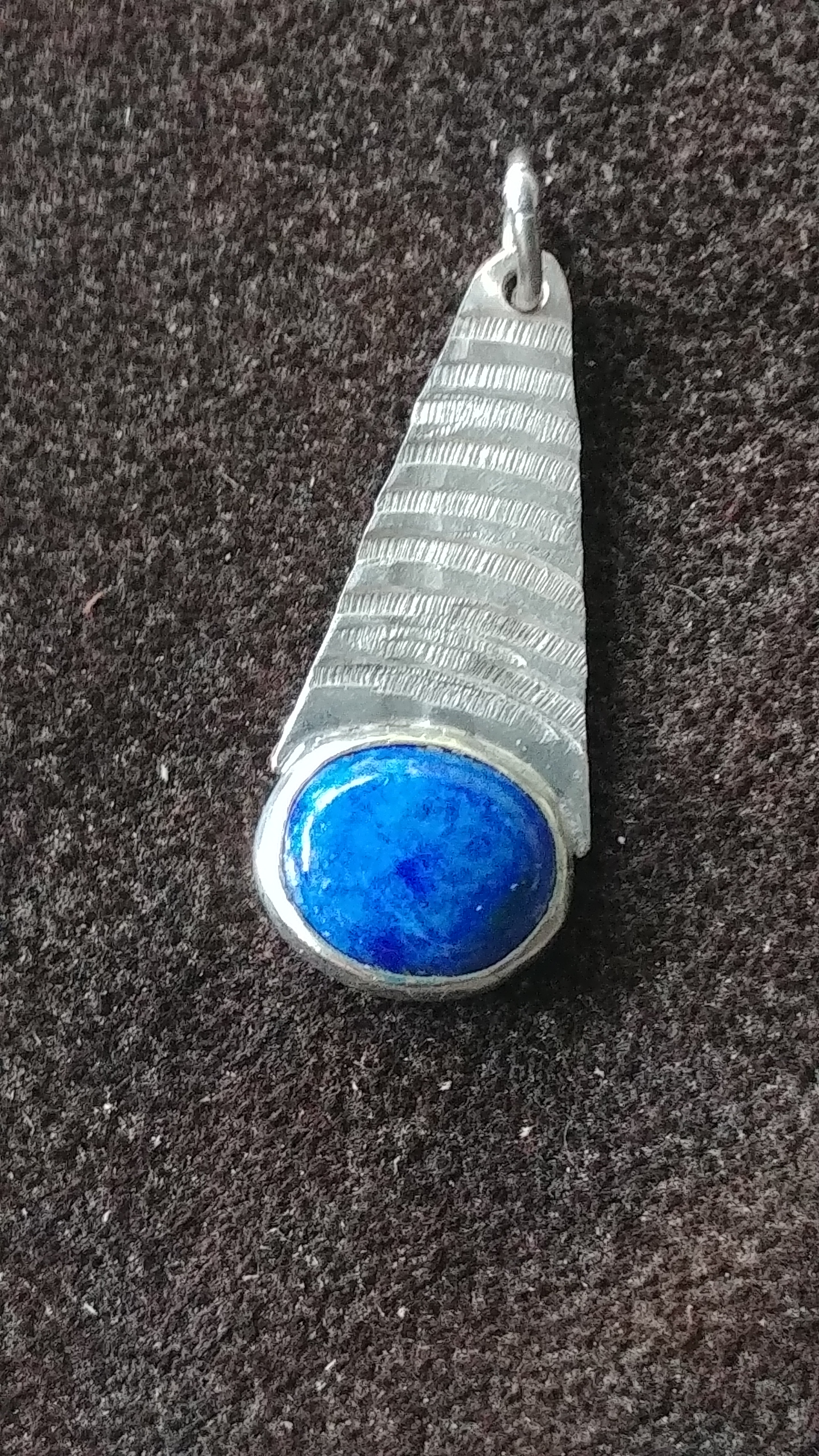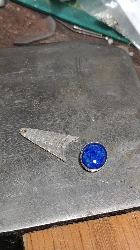 I just got in a nice little pile of 8mm x 10mm lapis lazuli cabochon. I bought these specifically to go with some 8×10 silver bezel cups that I’ve had in my jewelry tool box for a long time. Late night I went to the bench and came up with this simple triangular necklace. Nothing particularly fancy, but on the plus side, it won’t be too expensive either… about $60 including the chain.