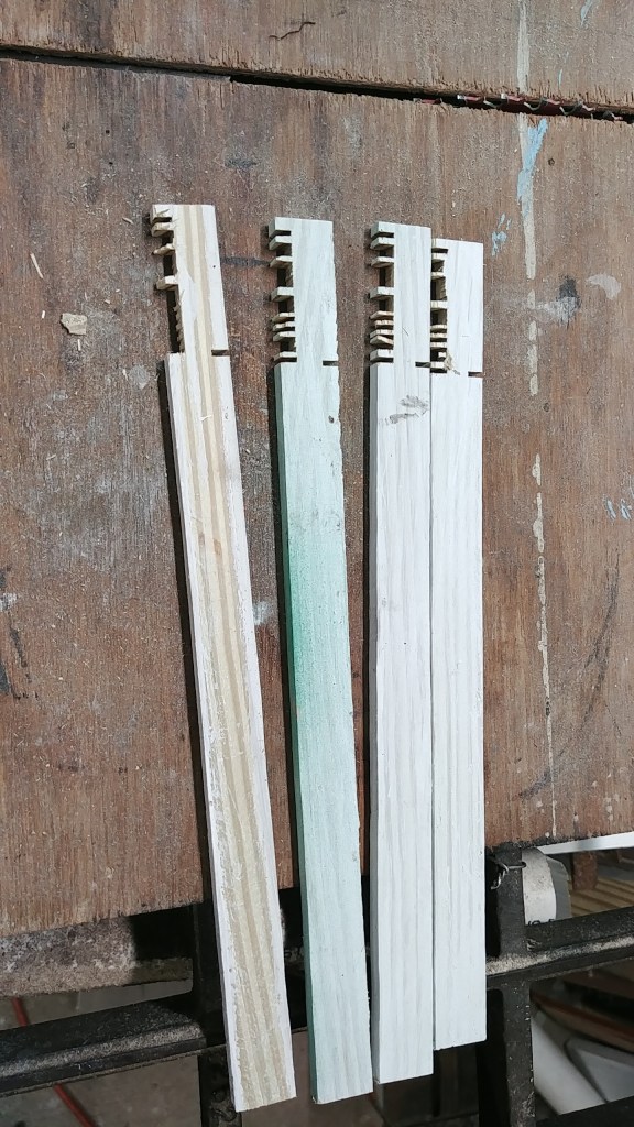 I started by standardizing the size and thickness, which happened to be the same size of some scrap wood that I had left over from a recent deck project. Then on my table saw (everyone should have a table saw… though this could be done with a pocketknife) I cut down the edges by about a third, leaving a roughly 1/4″ square stem. This I sanded to an octagon shape using a bench belt grinder, but this could also be done with a fine file or even another emery stick.