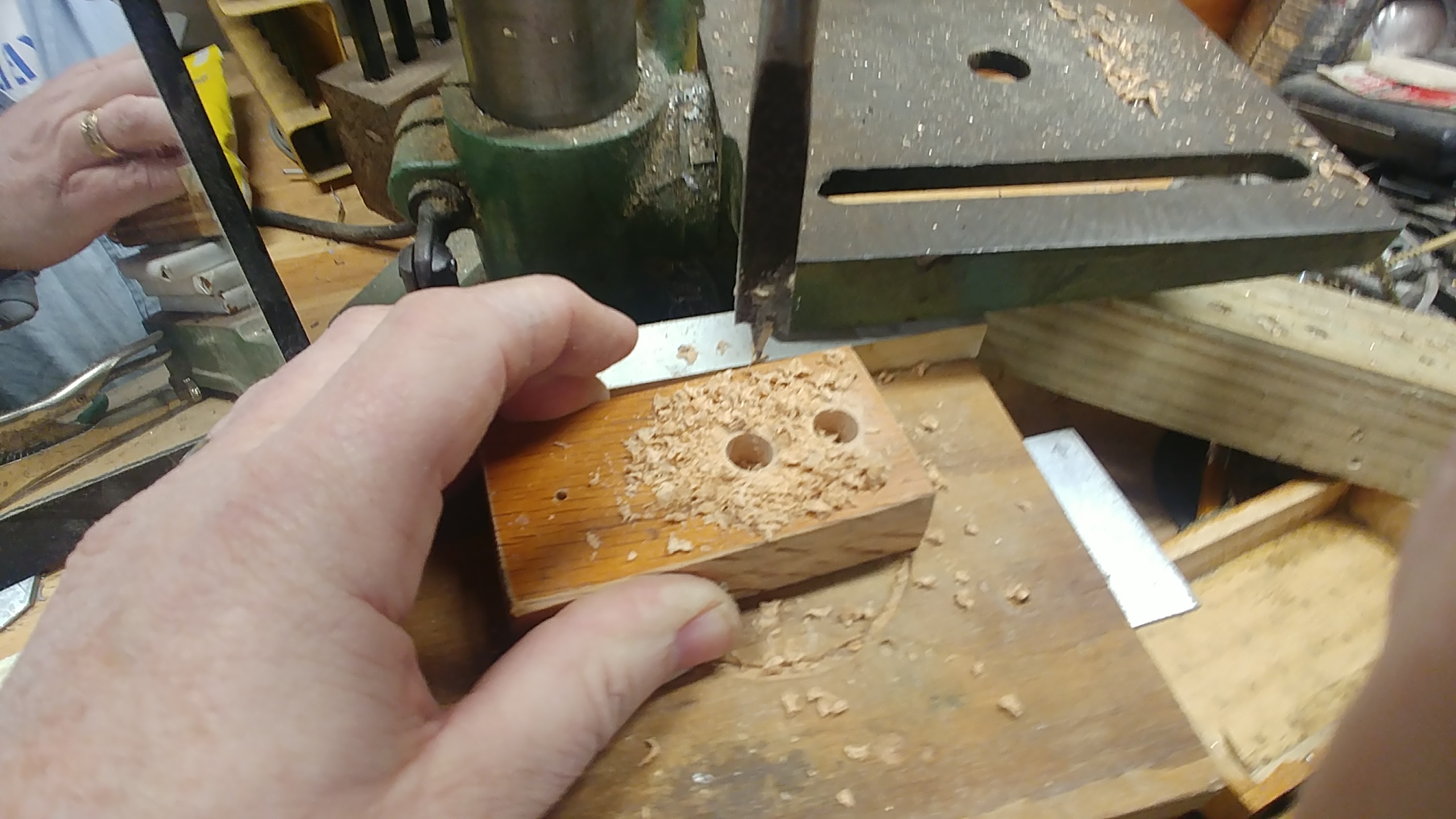 Step two was just to find a hardwood block and drill some holes. I have some oak what was formerly a headboard that I liberated from a trash pile. I cut a small block, sanded off the sharp edges, drilled the holes and gave it a coat of linseed oil just for fun, and the job was finished.