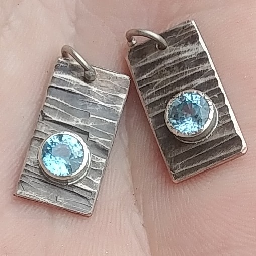 Here are some new earrings that I’ve recently finished. The square forms are something new, with the idea of being match for my necklaces… thanks to Sarah Bernzott at the Irritable Pelican Gallery for the suggestion. They’re made of hammered sterling silver plate with hot-forged nickel on copper trim, riveted together with a small piece of sterling silver wire. Accent beads on the earwires are blue topaz and peridot. I always use gold-filled earwires, as some folks are allergic to cheaper wires.