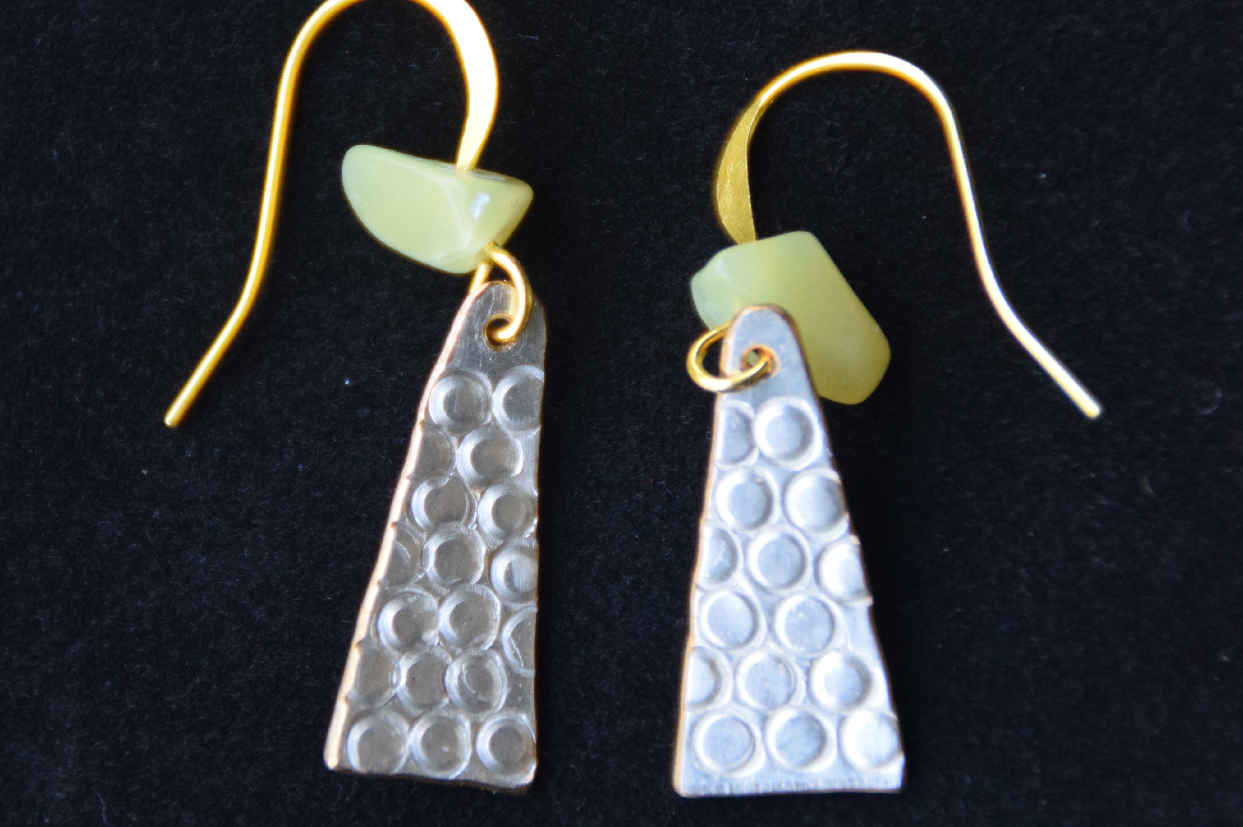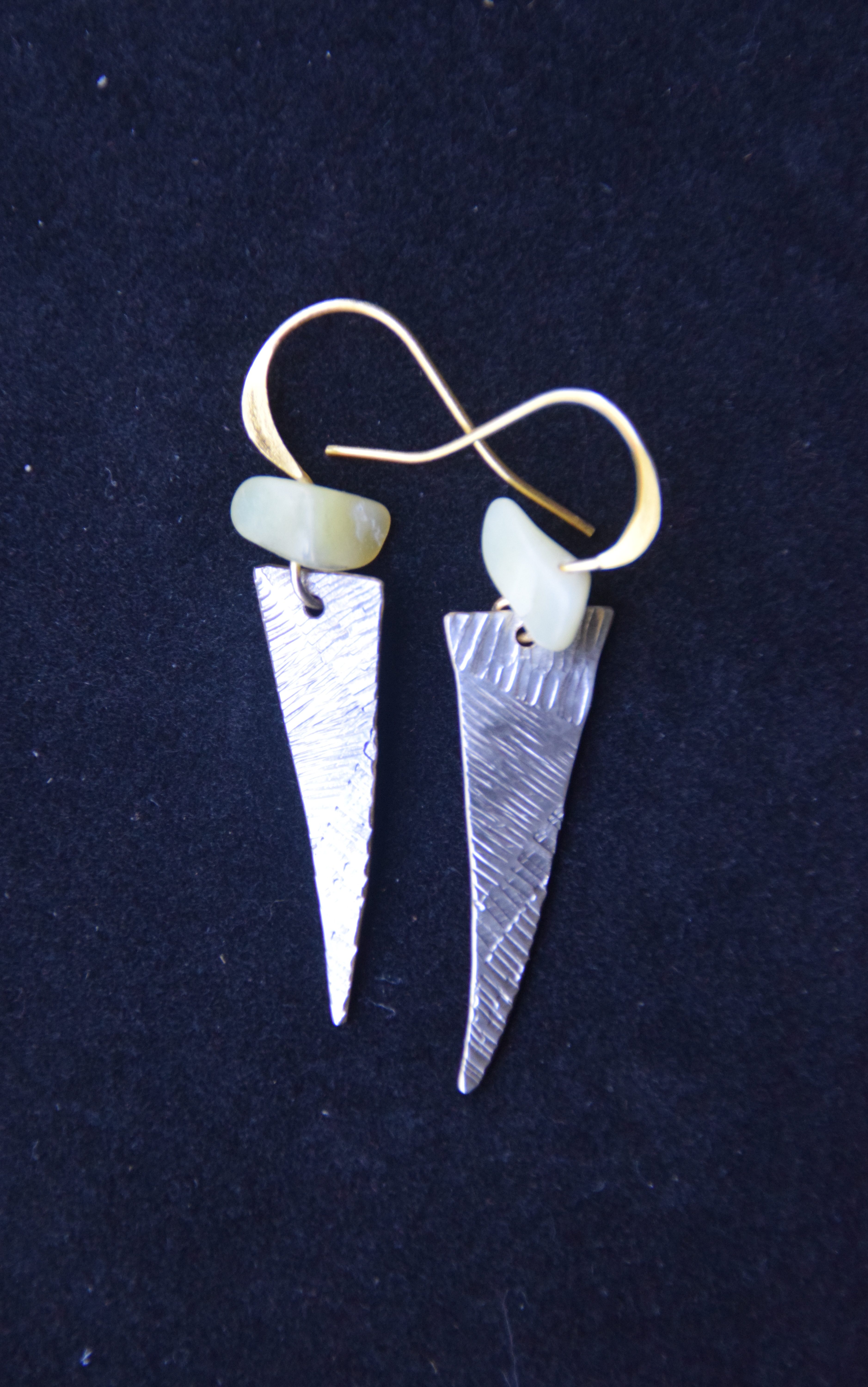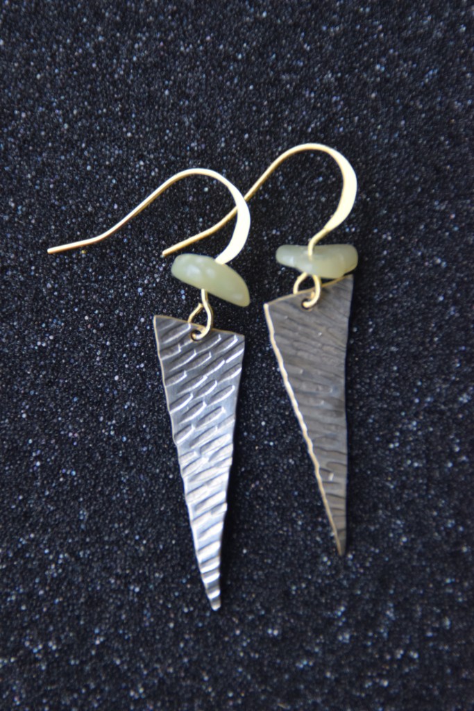 #091721.1 Earrings, 28x9mm sterling silver on copper inverted triangular dangles, patterned linear embossing, w soo chow jade beads