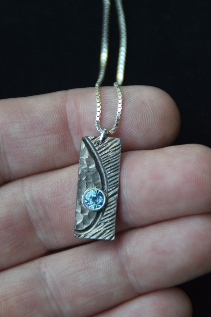 “Split” necklace, 28x31mm forged silverplate on copper, with 6mm aquamarine in a silver tube setting, $120