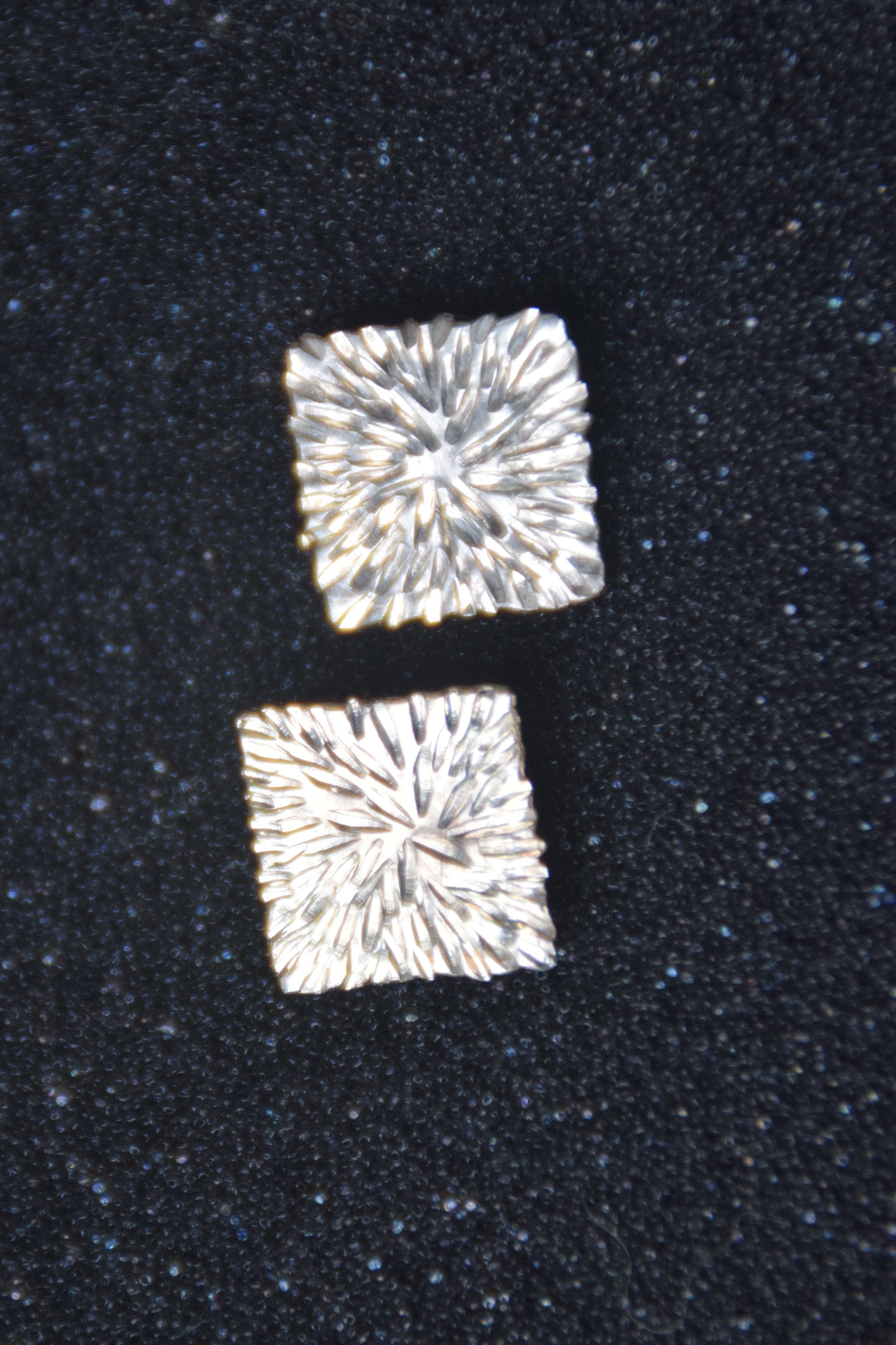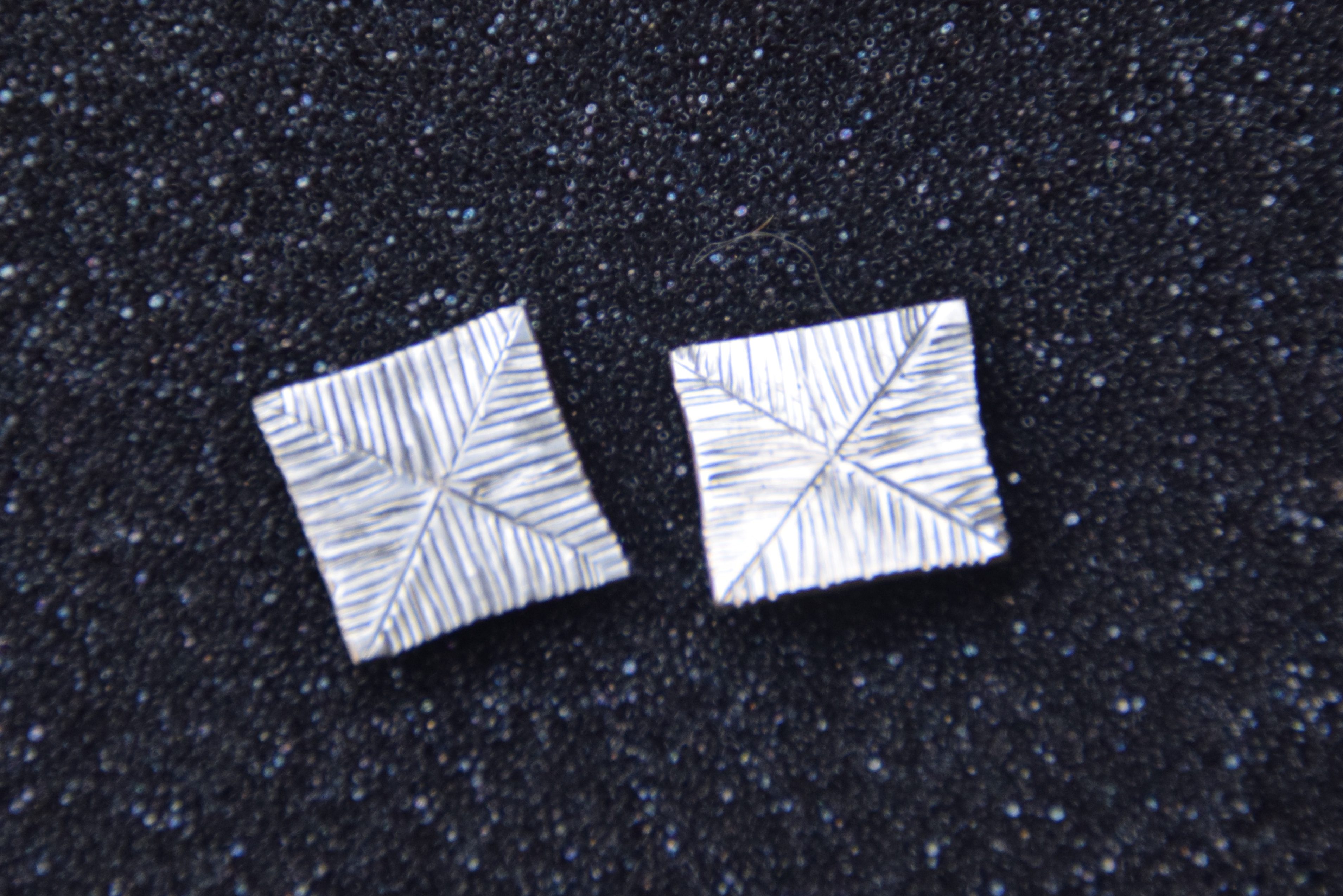 91621.5, Earrings, 10mm sterling silver on copper square studs, “cross” embossing