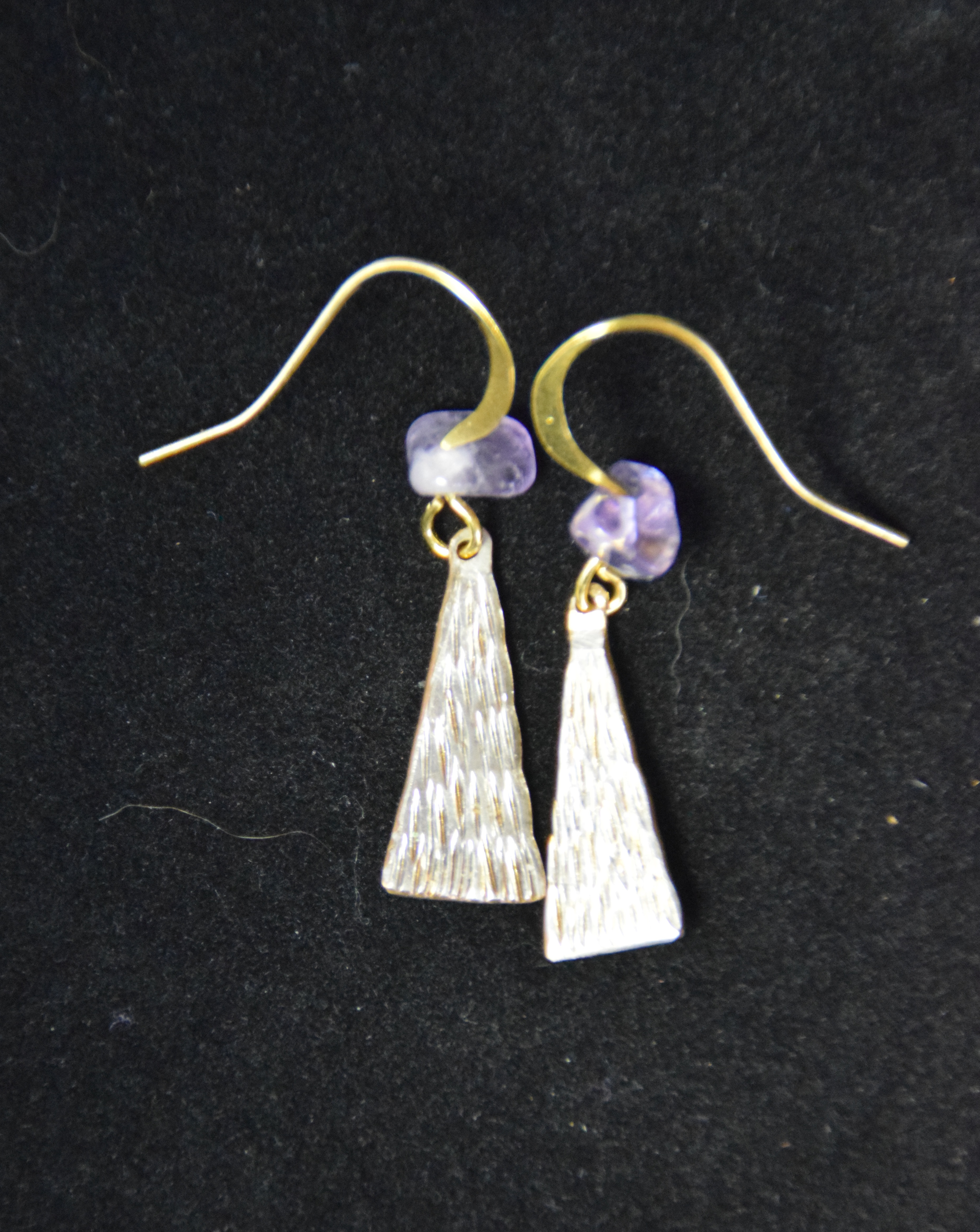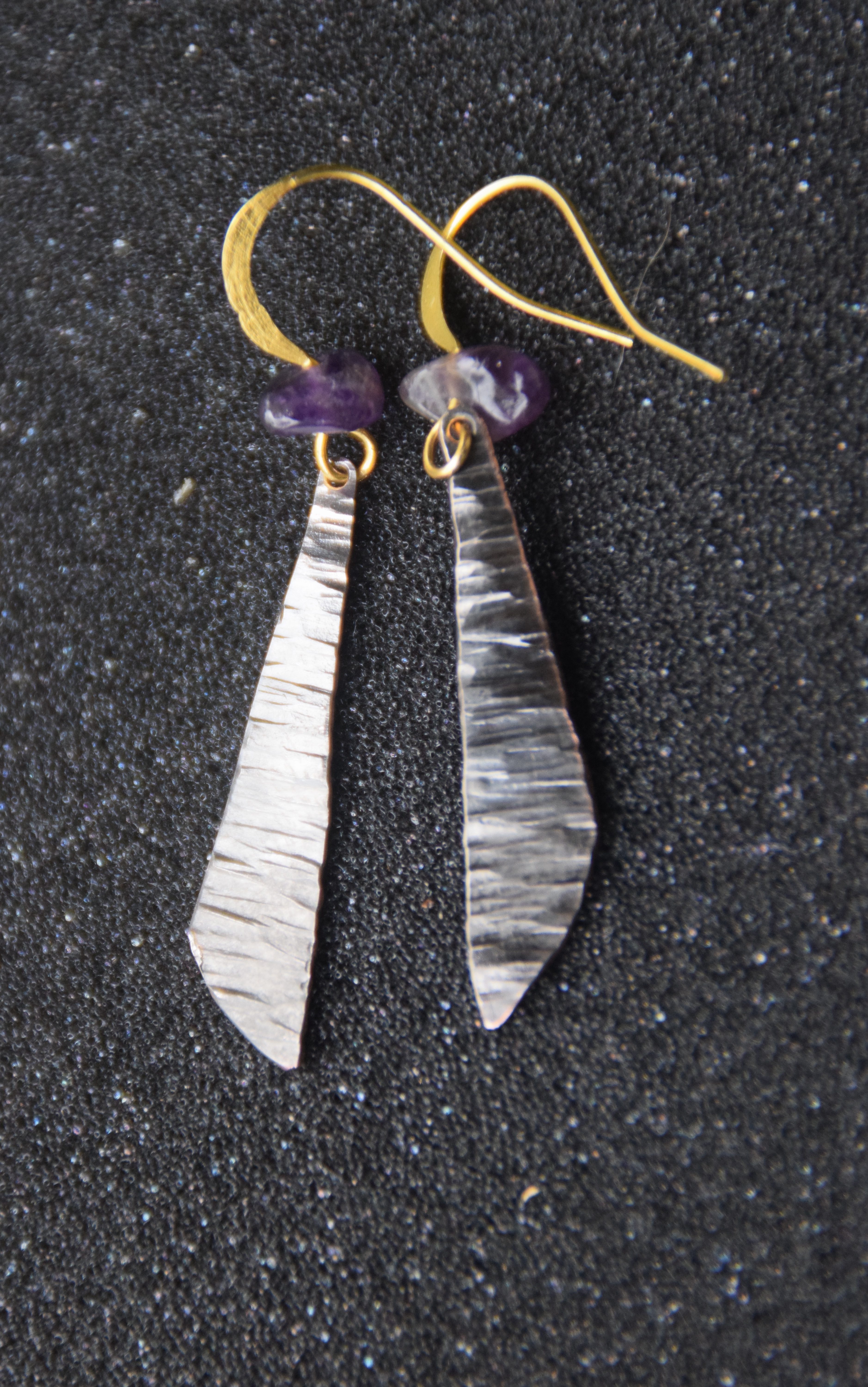 91621.2, Earrings, 32x7mm dangles, nickel silver on copper, amethyst beads, $35