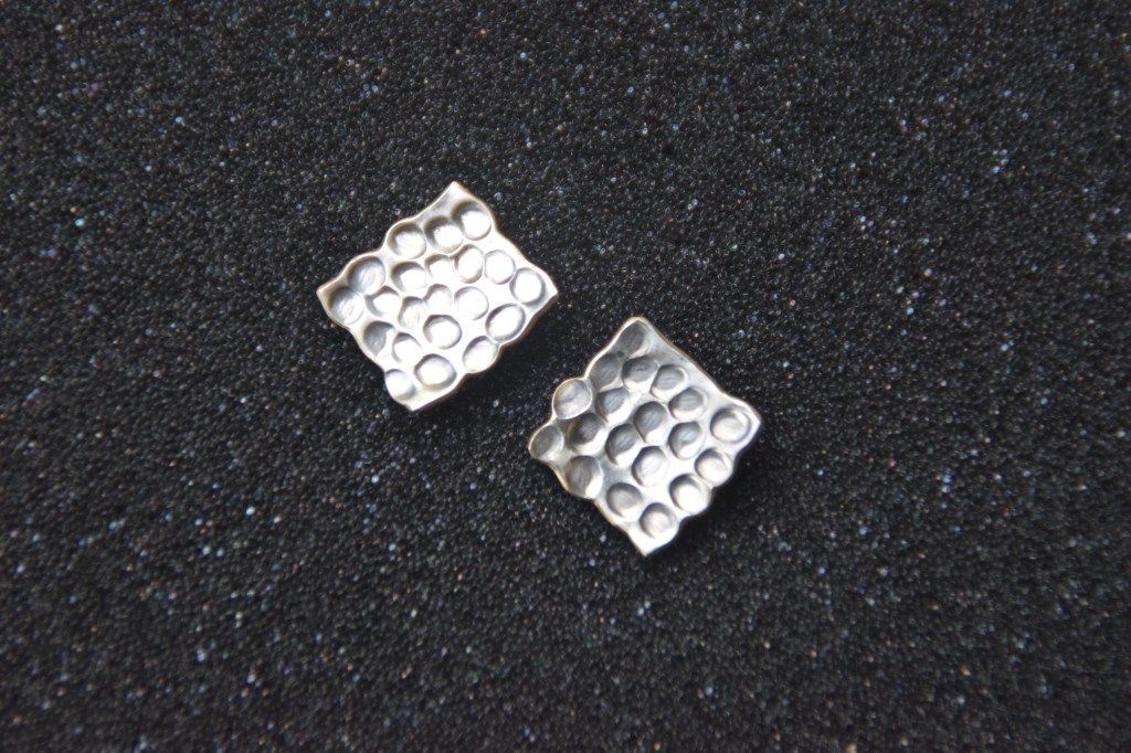 #091721.3, Earrings, 12mm sterling silver on copper square studs w “golf ball” embossing, $40