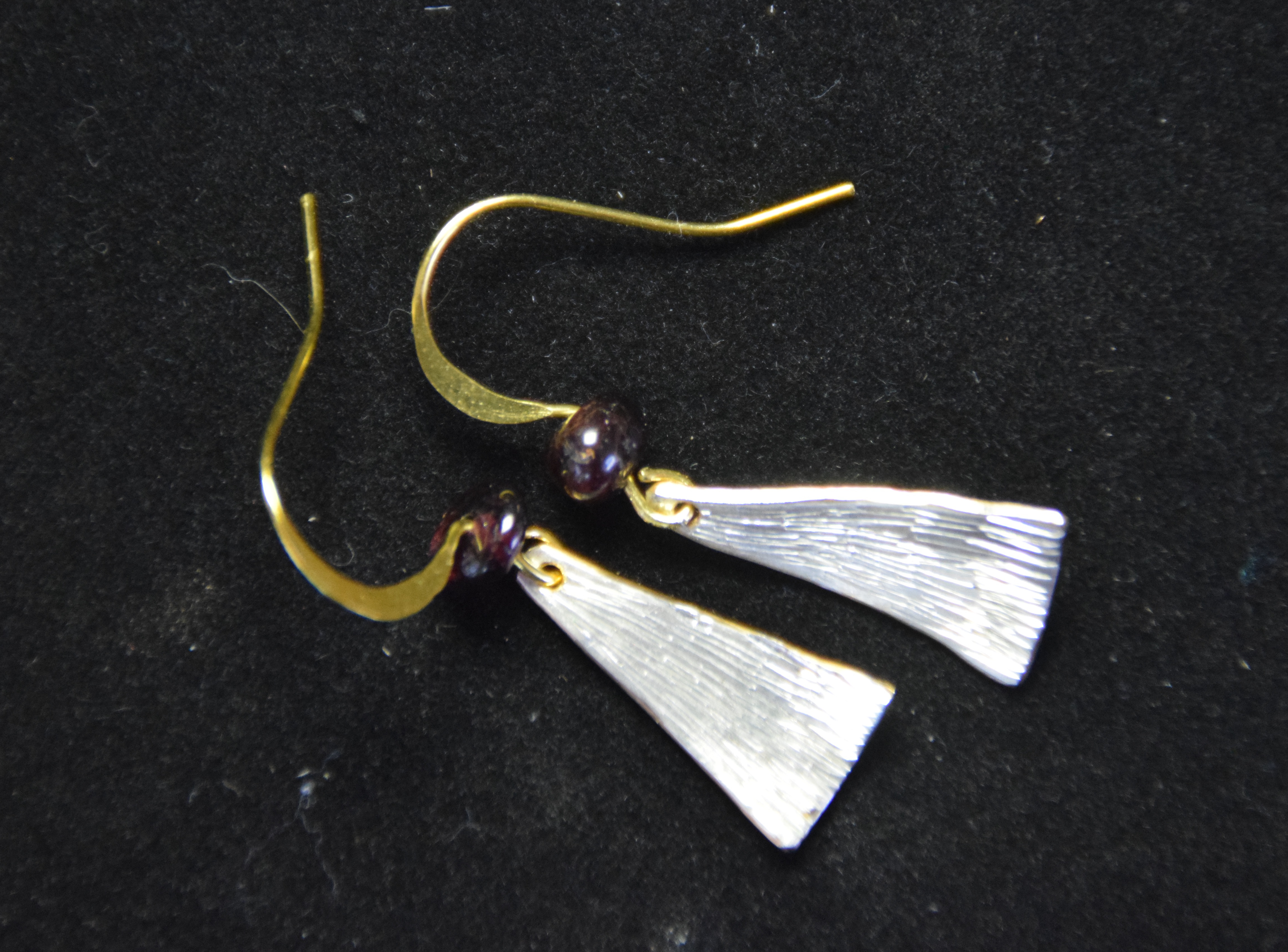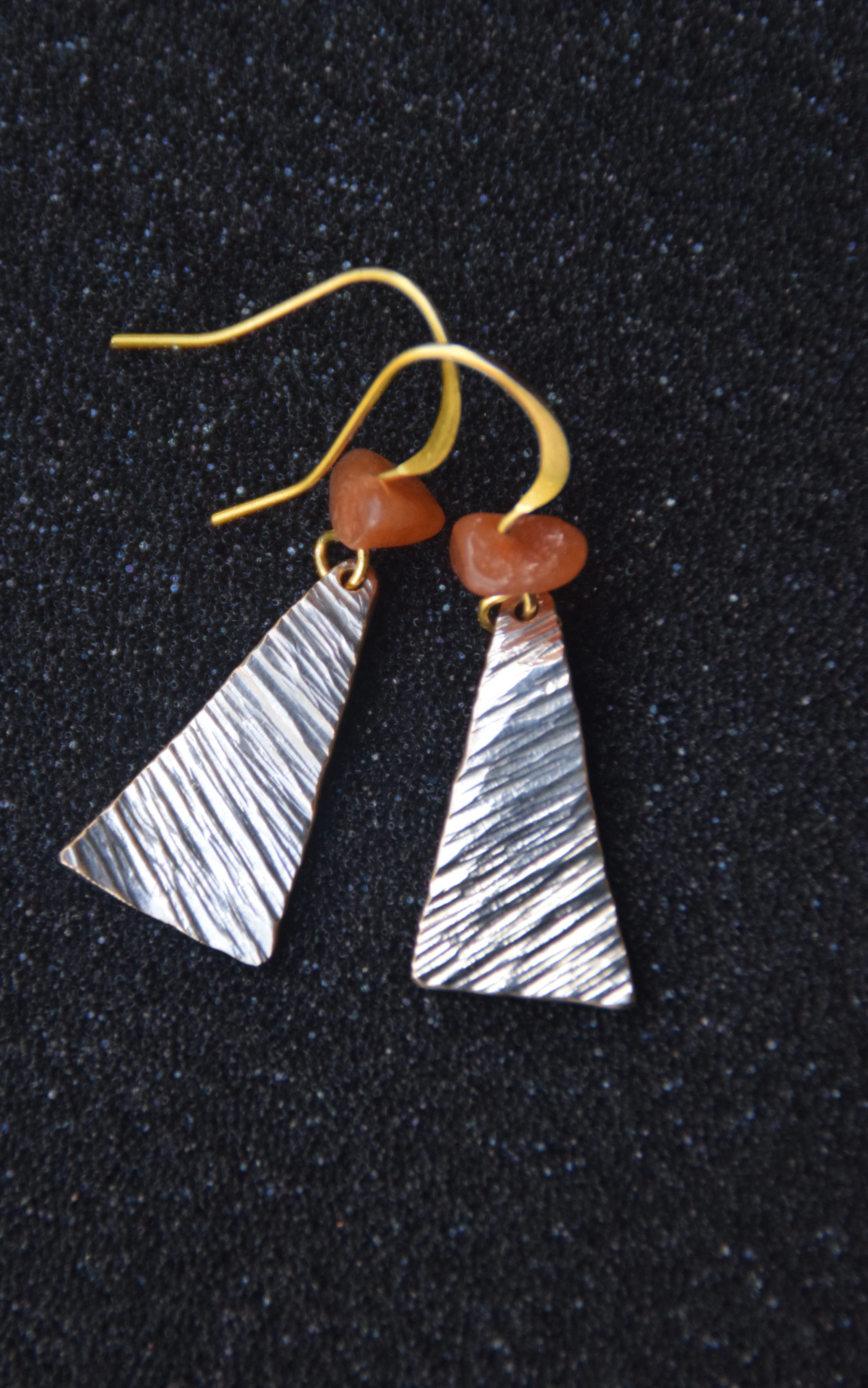 #091721.5, Earrings, 21x12mm sterling silver on copper triangular dangles, diagonal embossing, slight recurve, w red aventurine beads