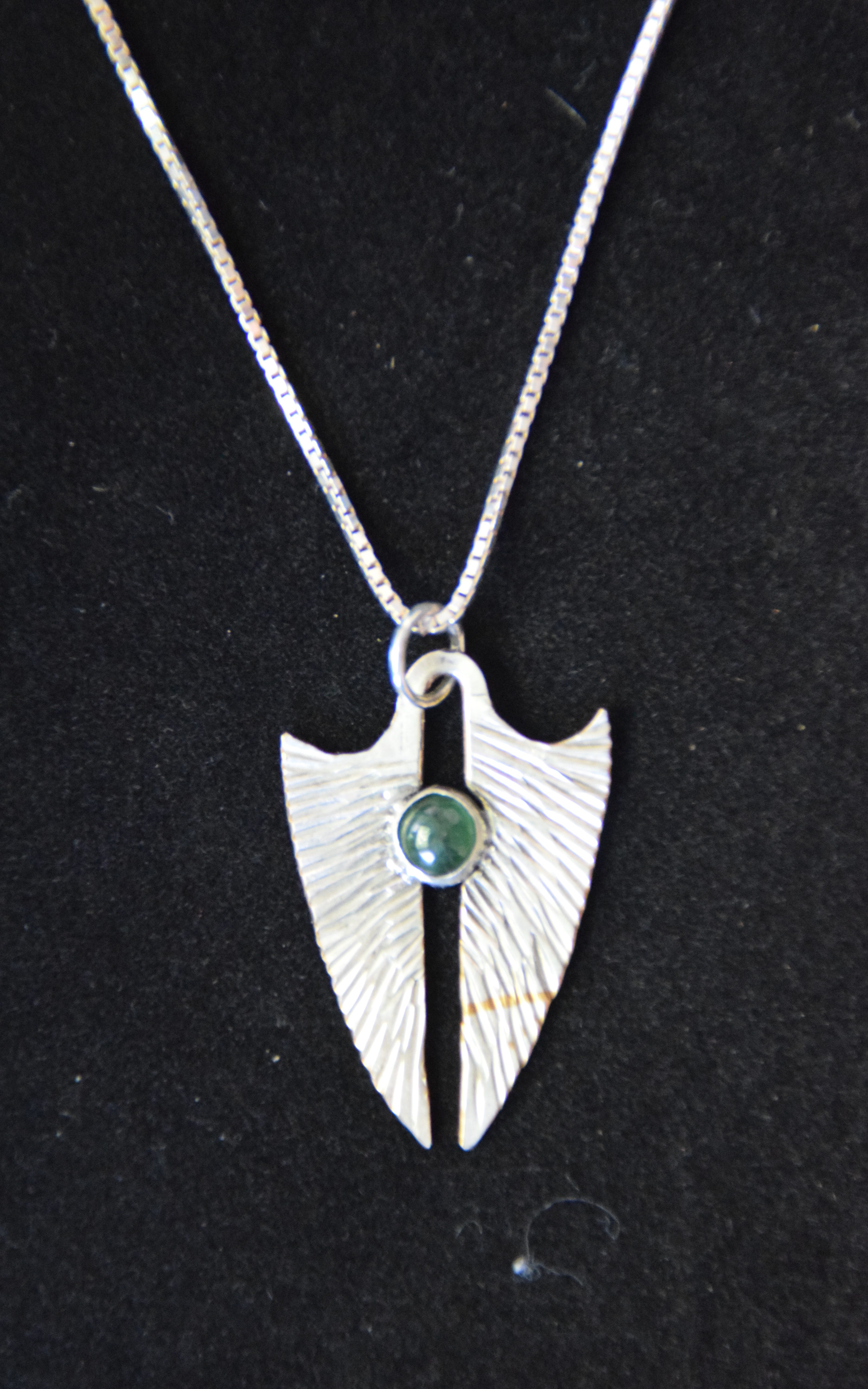 “Split” necklace, silverplate on copper, 29x19mm, 5mm emerald cabochon, $90