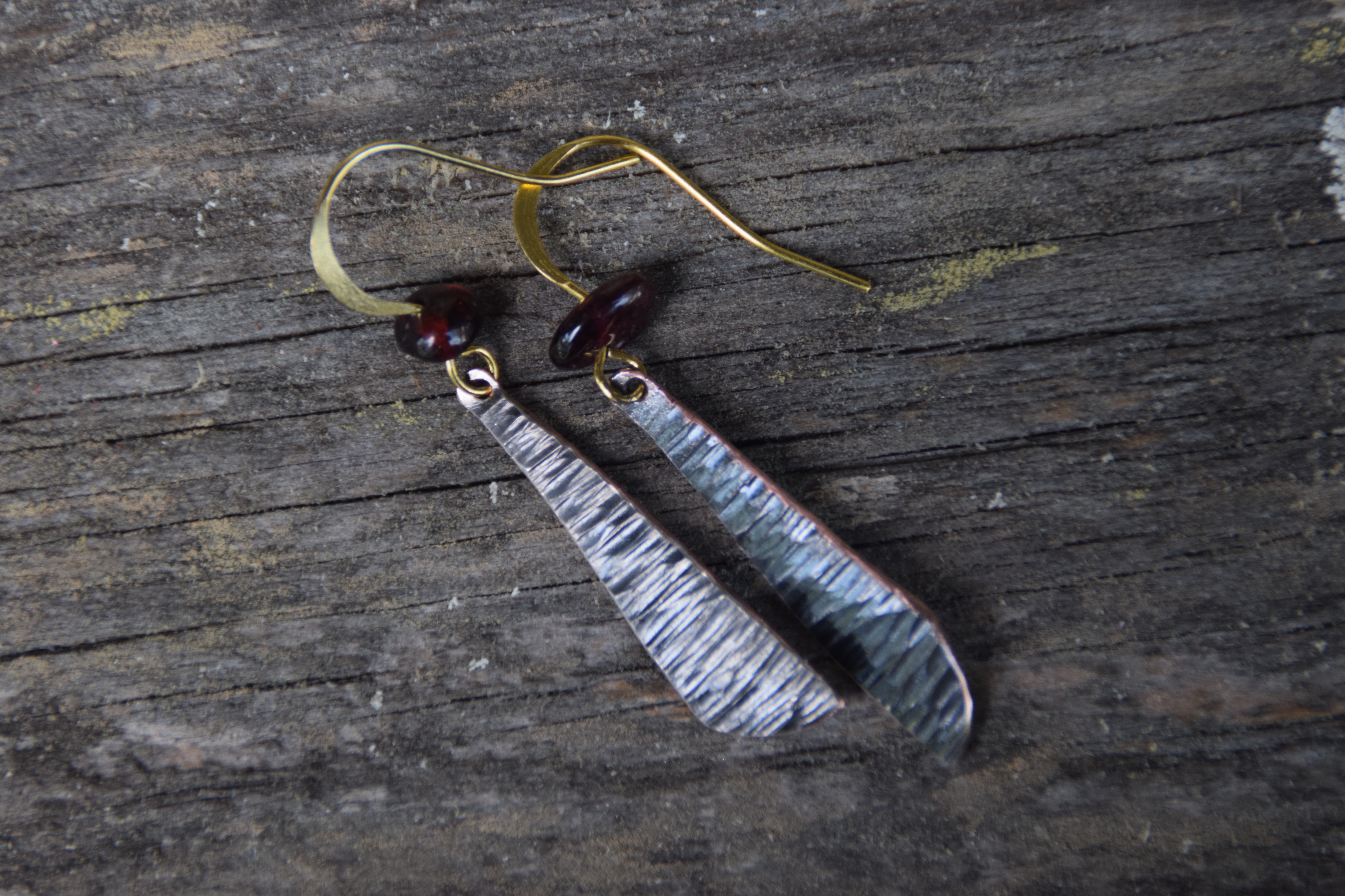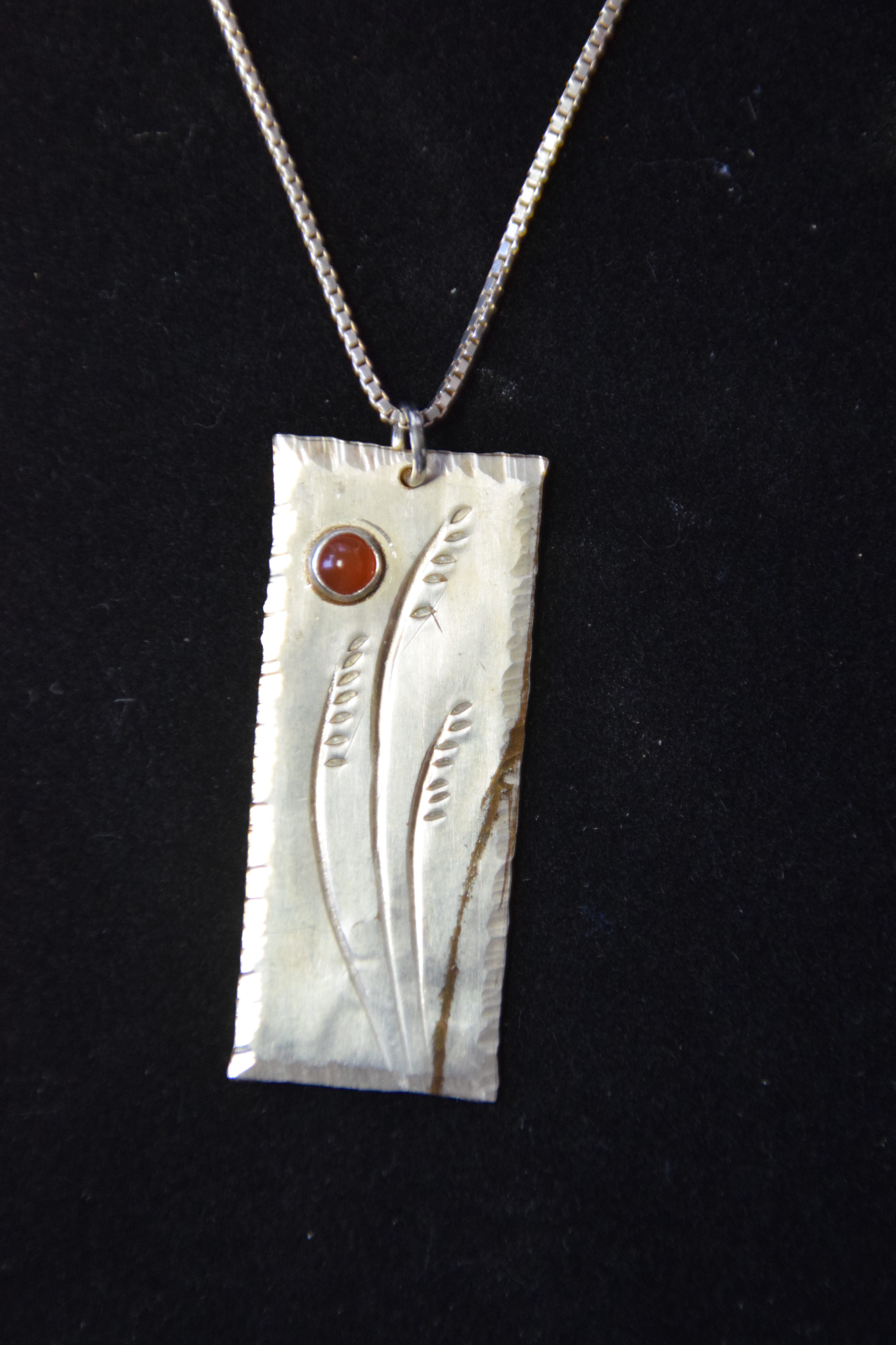 Sea Oats necklace, 40x16mm forged silverplate on copper with 5mm carnelian cabochon. $80
